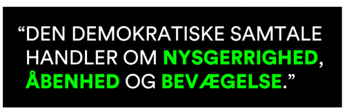 Temaerne tager udgangspunkt i Alternativets tre bundlinjer. Hvad der bevæger dig ved du bedst selv, og demokratiske samtaler kan se ud på uendeligt mange måder. Herunder er forslag til samtaleemner og inspiration til måder at arrangere og strukturere samtaler:
